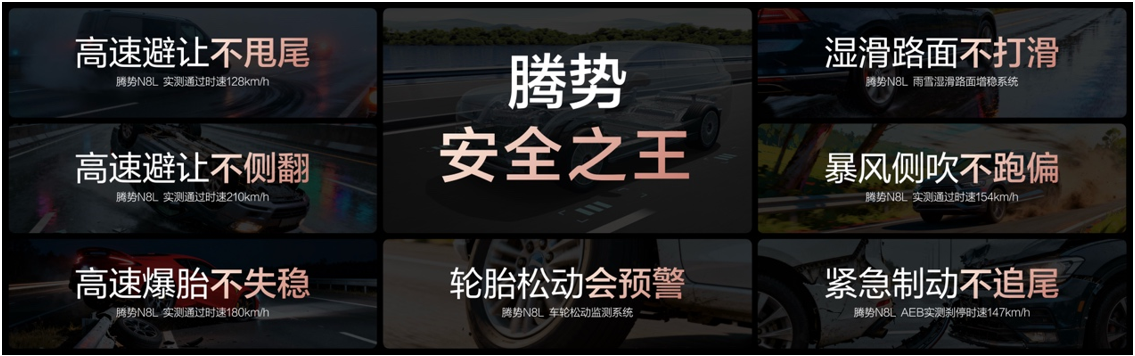 主动安全方面,得益于易三方,腾势N8L能够以128km/h高速避让不甩尾、210km/h高速避让(鱼钩测试)不侧翻、180km/h高速爆胎不失稳、154km/h暴风侧吹不跑偏、147km/h AEB自动紧急制动、不怕雨雪路面打滑、车轮松动监测系统,以科技安全守护家人出行安心。腾势汽车不愧被称为新能源汽车的“安全之王”。
