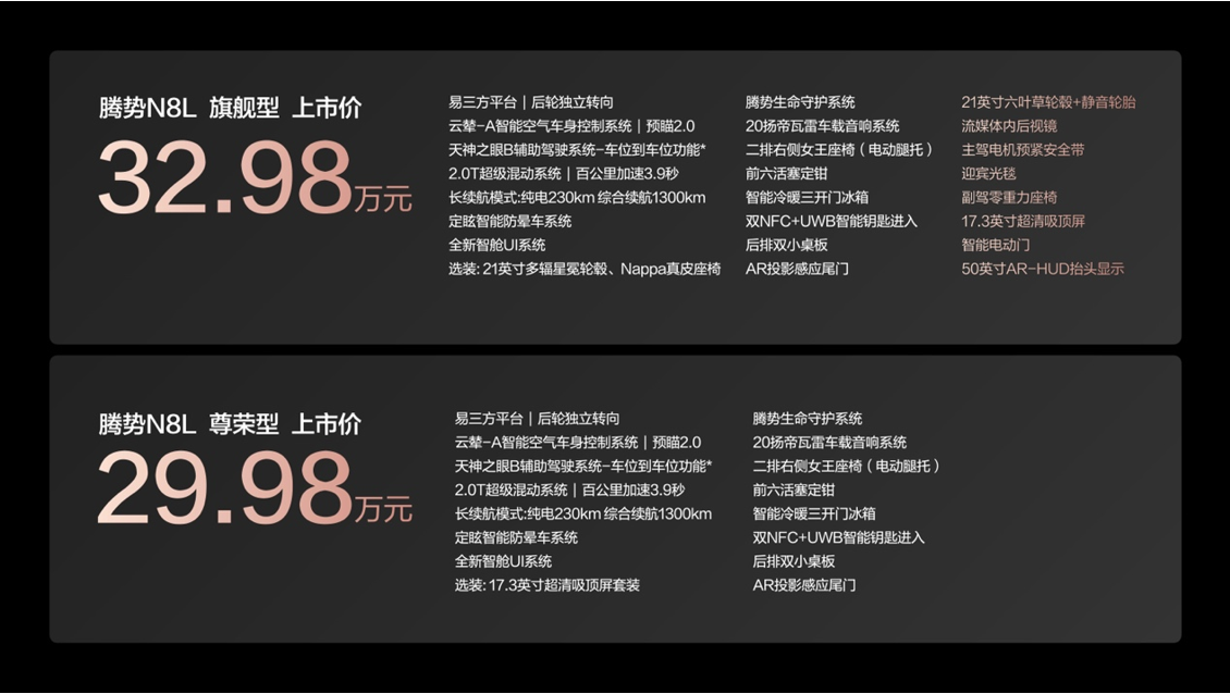 10月28日,“大六座安全豪华SUV”腾势N8L正式上市,共推出2款车型,官方指导价为29.98万元~32.98万元!N8L全系标配“六大核心科技”,以超越传统豪华的品质标准,诠释家用车的豪华感、安全感与科技感,创造让全家人动心、舒心、省心、安心、暖心的出行体验,以“五心体验 三感相伴”,定义美好出行。