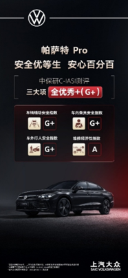 高强度及以上钢材比例数量高达90%、全系标配10安全气囊等硬核配置,铸就了帕萨特Pro卓越的安全性能。在中保研发布的中国保险汽车安全指数(C-IASI)2024年测评车型第三次结果中,帕萨特Pro在“车内乘员安全”、“车外行人安全”和“车辆辅助安全”三大项均获得优秀+(G+)成绩,印证了其过硬的大厂品质。