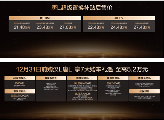 此次,唐L EV 3款车型,补贴后售价22.48万~27.48万元;唐L DM 3款车型,补贴后售价21.48万~27.08万元;同时,比亚迪还为用户准备了包含置换补贴在内的至高价值4.5万元尊享礼遇,让旗舰体验触手可及。