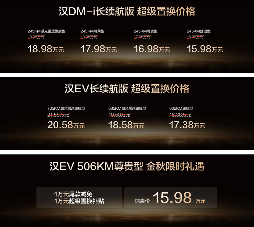 此次,汉DM-i长续航版共推出4款车型,补贴后售价15.98万~18.98万元;汉EV长续航版共推出3款车型,补贴后售价17.38万~20.58万元(10月31日前完成订车可享1万元超级置换补贴)。同时,比亚迪还为用户准备了包含置换补贴在内的至高价值3.8万元七大礼遇。