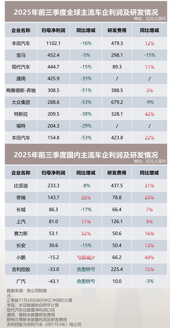 在盈利情况层面,受美国关税政策冲击及中国市场销量下滑影响,海外车企的净利润出现普遍性下滑,其中奔驰、大众、本田利润降幅超50%,全球利润最高的丰田降幅也达16%。反观国内头部车企,比亚迪、奇瑞前三季度净利润均突破百亿元,展现出更强的盈利韧性。