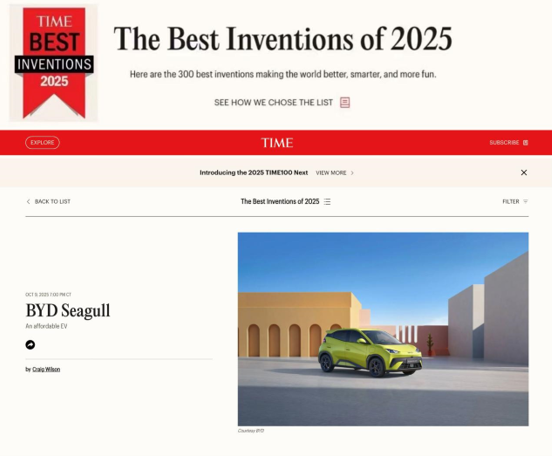 近日,美国《时代周刊》(TIME)正式公布了2025年度最佳发明榜单。凭借卓越的创新实力和全球市场的高度认可,比亚迪海鸥成功入选交通运输领域最佳发明。