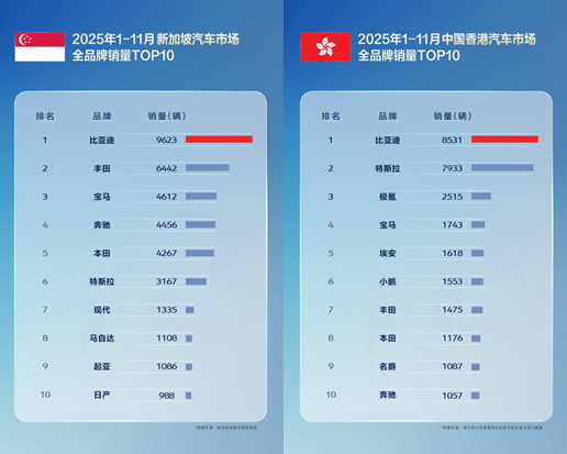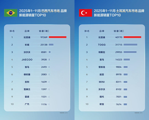 11月,比亚迪在巴西、土耳其、意大利、西班牙、匈牙利、克罗地亚等国拿下了新能源汽车销量第一,在新加坡等国家获得全品牌销冠。1-11月累计表现同样不俗,在巴西、土耳其、西班牙、意大利等国,比亚迪位列新能源汽车品牌销量榜首,获得多个国家消费者认可;在新加坡、中国香港等地区市场荣膺全品牌销量第一。