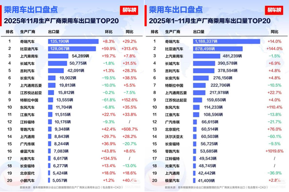 据易车数据显示,2025年11月,比亚迪乘用车出口量达到12.8万台,同比增长313.4%;今年1-11月累计出口87.8万台,同比增长144%,较2024全年总出口量已实现翻倍式增长,比亚迪成为中国出口增速最快的车企之一。