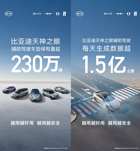 数据显示,截至2025年11月底,比亚迪搭载“天神之眼”驾驶辅助系统的车型累计销量已突破230万辆,持续蝉联中国辅助驾驶车型销量及系统装车量榜首。这标志着比亚迪推动的“全民智驾”战略已取得显著成效,智能驾驶正从高端配置加速向主流市场普及。