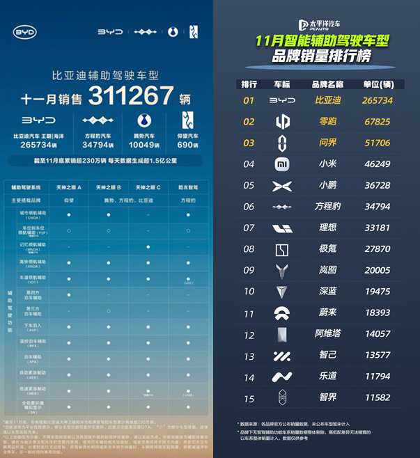 近日,比亚迪公布了其搭载天神之眼辅助驾驶系统的车型在11月的销售数据,全月销量达311267辆,继续引领市场。其中,比亚迪王朝与海洋系列贡献265734辆,方程豹、腾势、仰望等高端及个性化品牌亦表现稳健,共同构筑了比亚迪在智能驾驶领域的强大产品矩阵。